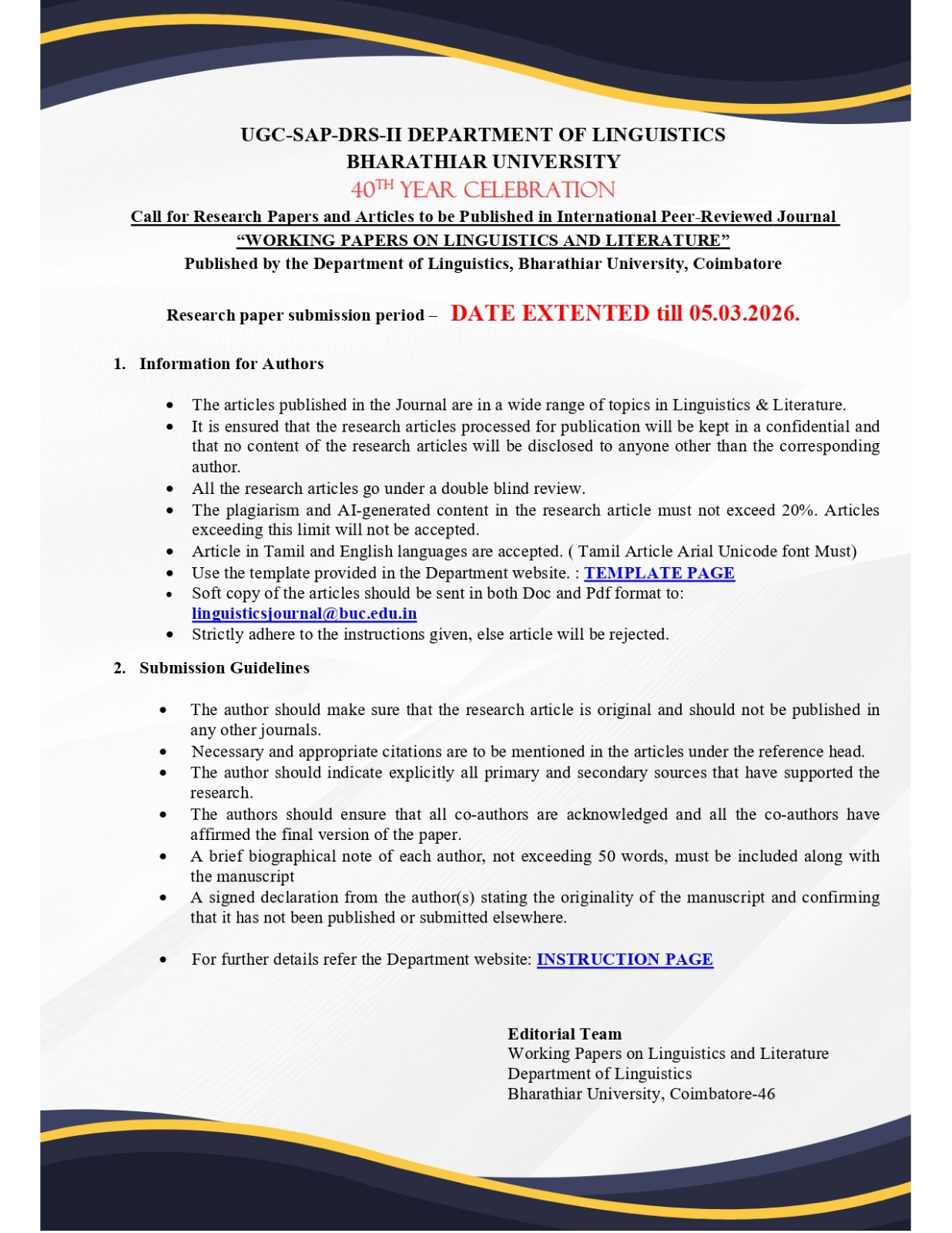 Time Extended up to 17.02.2026 @ 3.00 pm for the submission of e-tenders towards the purchase of Consumables to the Department of Textiles and Apparel Design.
